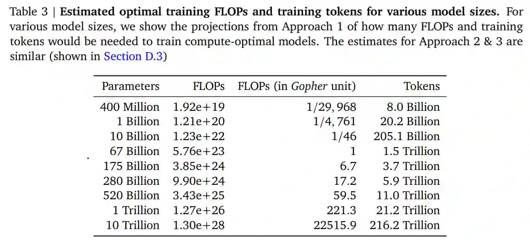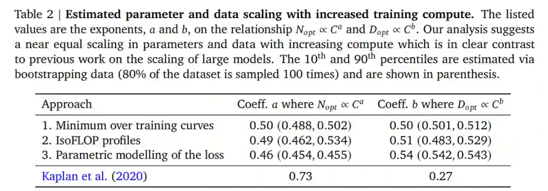 三种方法的预测结果类似,表明模型参数和训练 tokens 的数量应该随着计算量的增加而增加,比例如下表 2 所示。这与以前有关该主题的工作形成鲜明对比,值得进一步研究。