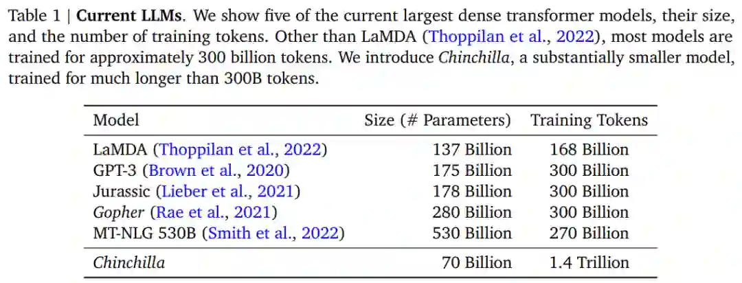 继 Kaplan 等人和 GPT-3 的训练设置研究之后,近期大型模型的训练 token 大约为 3000 亿个(表 1),这与增加算力时,主要采用增加模型大小结论一致。