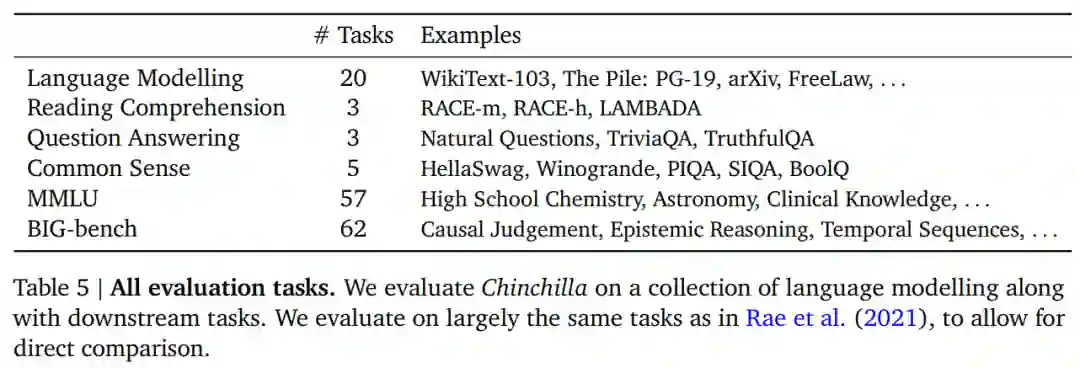 研究者对 Chinchilla 进行了广泛的评估,与各种大规模语言模型在 Rae et al. (2021)提出的很多任务上展开了比较。这些任务包括语言建模(LM)、阅读理解、问答、常识、MMLU 和 BIG-bench,具体如下表 5 所示。