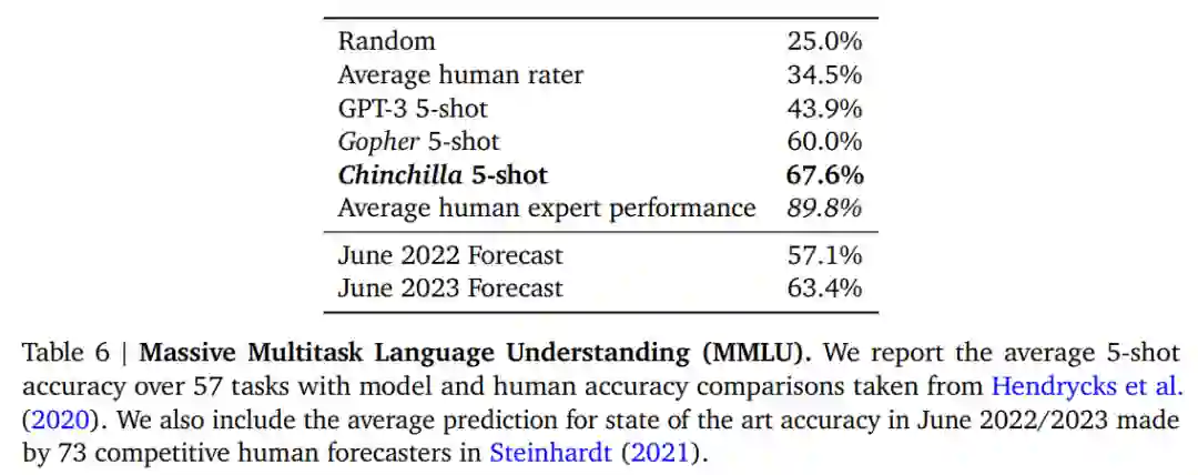 多任务语言理解(MMLU)任务。大规模 MMLU 基准测试包含一系列与学科类似的考试问题。在下表 6 中,研究者展示了 Chinchilla 在 MMLU 上的平均 5-shot 性能。可以看到,尽管规模小得多,但 Chinchilla 明显优于 Gopher,平均准确率为 67.6%,比 Gopher 提高了 7.6%。并且,Chinchilla 的准确率甚至超过了 2023 年 6 月专家预测的 63.4% 。