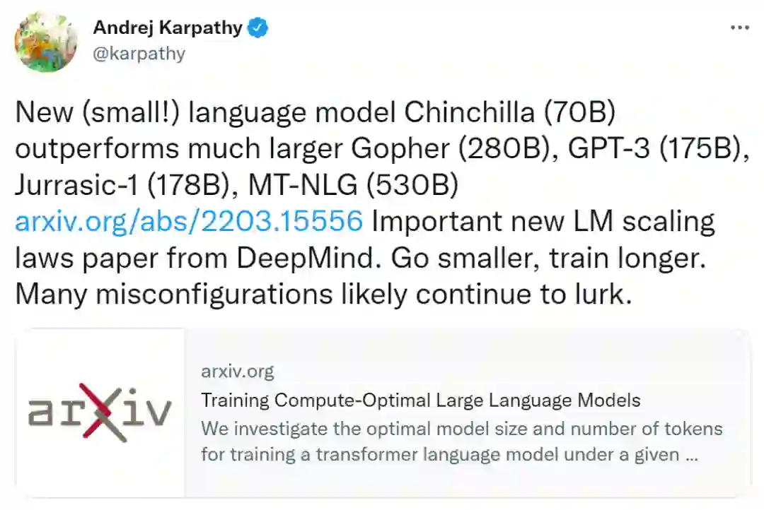 特斯拉人工智能和自动驾驶视觉总监 Andrej Karpathy 表示:Chinchilla 是一个新的语言模型(70B),它优于 Gopher (280B), GPT-3 (175B), Jurrasic-1 (178B), MT-NLG (530B) 大模型。这是关于语言模型(LM)新的扩展定律非常重要的论文。