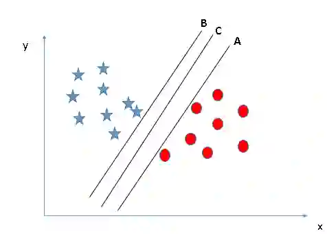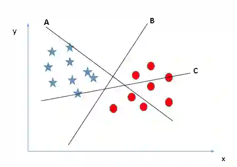 下图中有三个超平面:A、B和C。那么其中哪个是正确的边界呢?只需记住一点:SVM选择的是能分类两种数据的决策边界。很显然,相比A和C,B更好地分类了圆和星,所以它是正确的超平面。