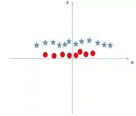 让我们继续关注直线这个话题。在下图中,两类数据之间已经不具备直线边界了,那么SVM算法会怎么分类?请想象电视剧中大侠拍桌震起酒杯的画面。图中目前只有X和Y两个特征,为了分类,我们可以添加一个新特征Z = X2 + Y2,并绘制数据点在X轴和Z轴上的位置。