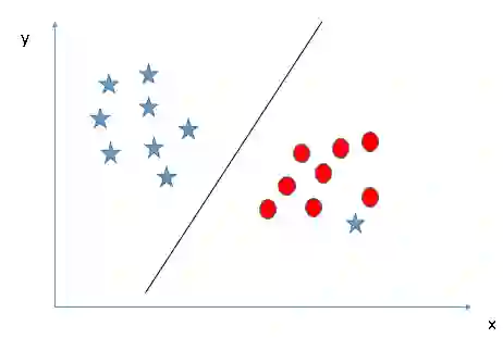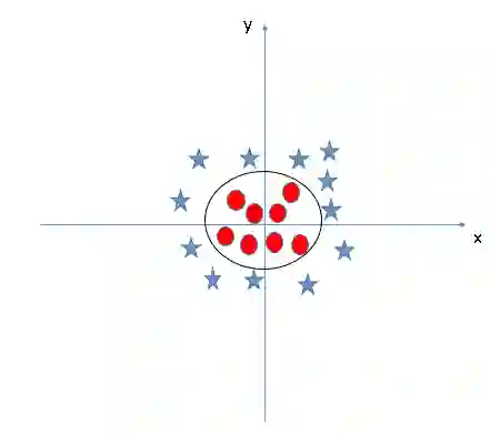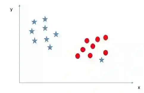 红色的圆点之间出现了一颗蓝色的星,并且它和其他同类数据不在同一侧。那么我们是否要绘制一条曲线来分类?或者说,是否要把它单独氛围一类?答案是否定的。