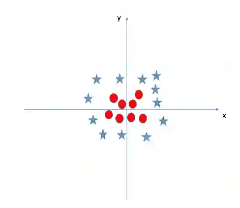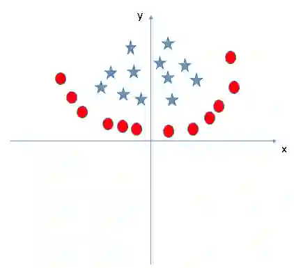 在前几个例子里,虽然我们把决策边界表述为超平面,但它们在图像中都是一条直线,这其实是不符合现实的。如在下图中,我们就无法用直线进行分类。