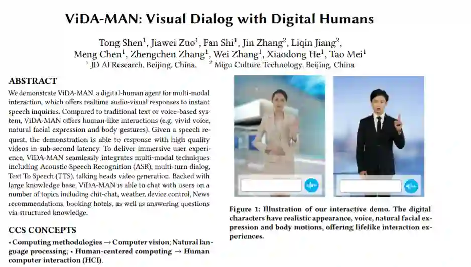 本文提出了一种多模式交互的数字人机代理 ViDA-MAN,为即时语音查询提供实时视听响应。与传统的基于文本或语音的系统相比,ViDA-MAN可以生成生动的语音、自然的面部表情和身体姿势。在给定语音请求的条件下,ViDA-MAN能够以亚秒级延迟响应高质量视频。