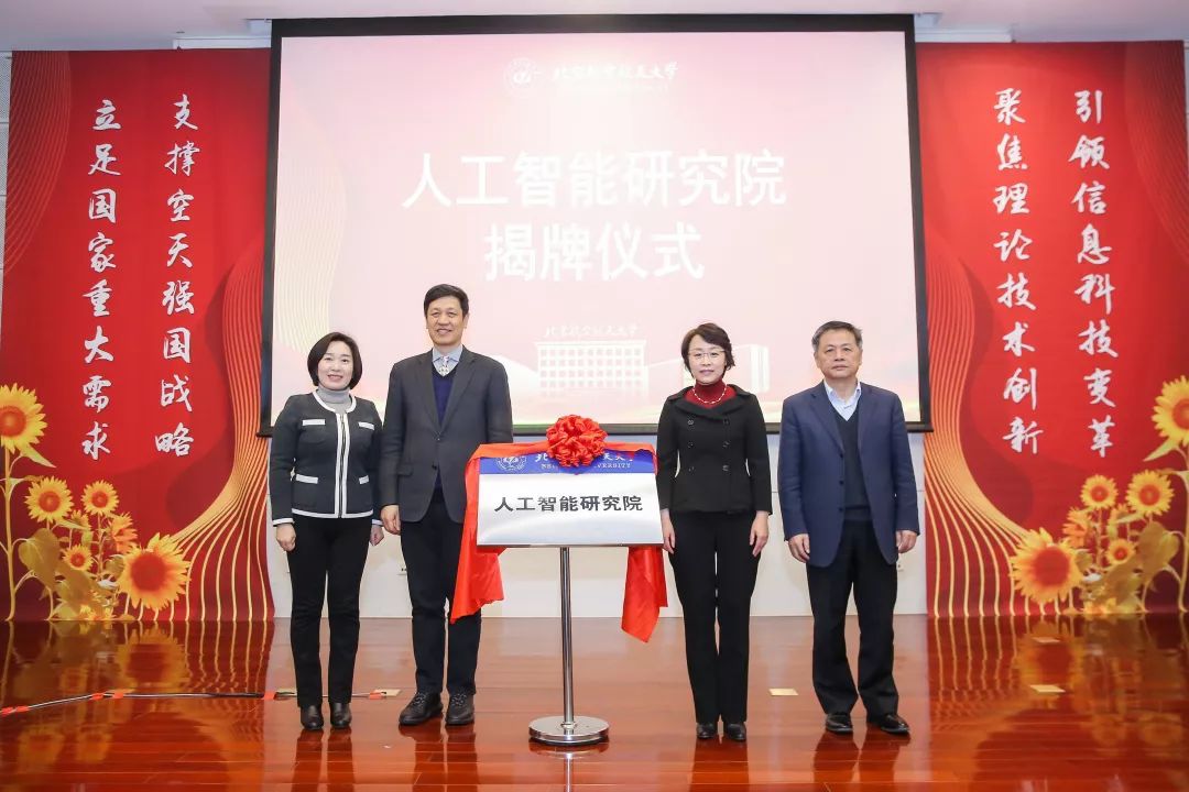 校党委书记曹淑敏、校长徐惠彬,人工智能研究院院长郑志明、党委书记金蓉为研究院揭牌。从左到右依次为金蓉、徐惠彬、曹淑敏和郑志明。