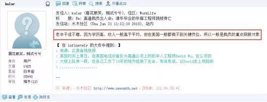 在清华水木社区论坛上,也有网友对此事件评论称,“老中(在美华人的一种自称)干活不错,因为学历高,收入一般高于平均,但在美国一般都做不到关键岗位,所以一般是裁员的重点照顾对象”。
