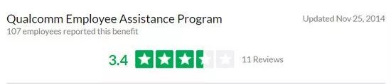 但每经小编(微信号:nbdnews)注意到,在美国一家可匿名点评公司的网站Glassdoor上,百余名高通员工对高通的“员工求助计划”评分仅为3.4分(满分5分,数据更新至2014年11月)。