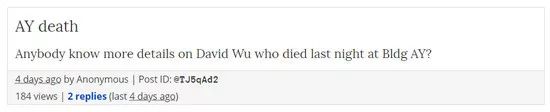 这条新闻周二(19日)才被媒体曝出,但其实周一就有人匿名在TheLayoff.com(一个供大公司员工讨论裁员信息的论坛)上发帖询问:“昨晚在AY大楼(高通办公楼)死亡的大卫·吴,有人知道更多细节吗?”但该帖很快被删除,只能在谷歌缓存中看到痕迹。