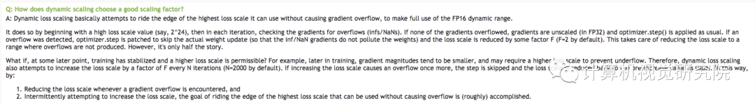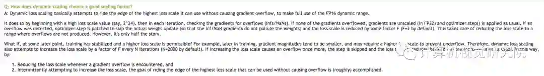 AMP默认使用动态损失放大,为了充分利用FP16的范围,缓解舍入误差,尽量使用最高的放大倍数(2^24),如果产生了上溢出(Overflow),则跳过参数更新,缩小放大倍数使其不溢出,在一定步数后(比如2000步)会再尝试使用大的scale来充分利用FP16的范围: