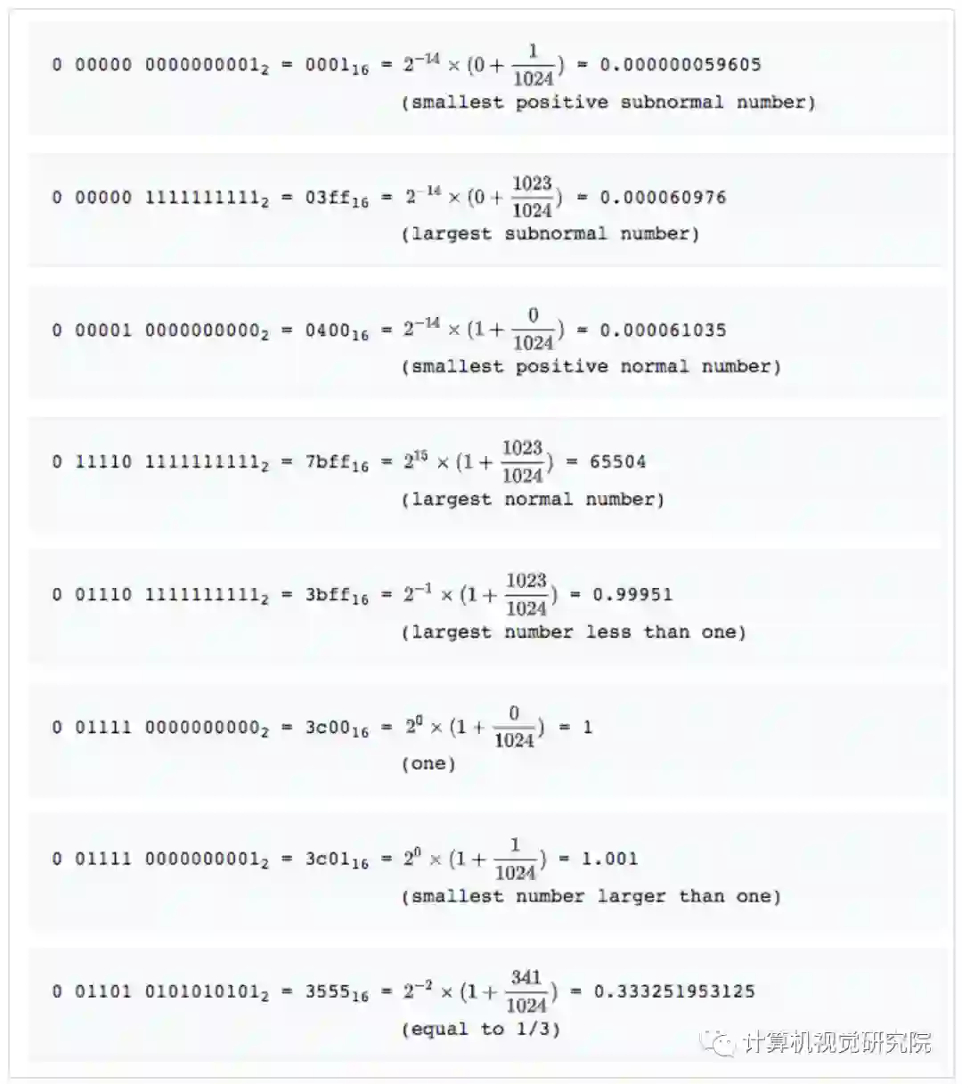 其中,sign位表示正负,exponent位表示指数(2^(n-15+1) (n=0)),fraction位表示的是分数(m/1024)。其中当指数为零的时候,下图加号左边为0,其他情况为1。