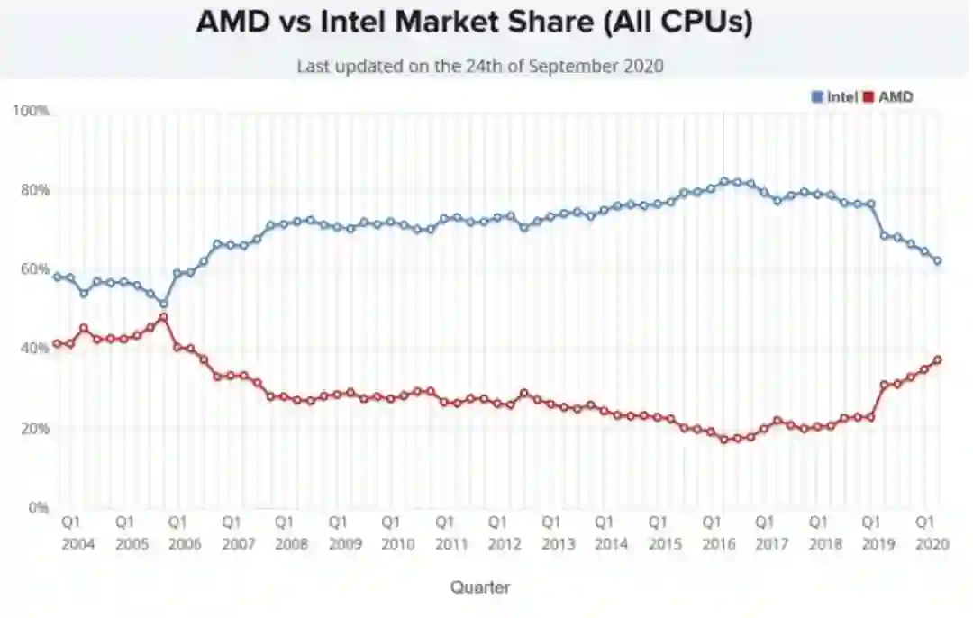 资本市场上,2015年AMD股价曾一度跌至2美元/股以下,市值跌到只有19亿美元。截止到2020年10月8日收盘,AMD股价已上涨至86.51美元/股,总市值约1015.68亿美元,今年来,该公司股价已累计飙升90%。第二财季显示,AMD收入增长26%,至19.3亿美元,净利润1.57亿美元,增长349%,而这得益于笔记本电脑以及服务器处理器创纪录的销售。