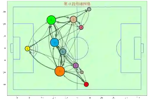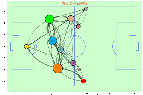图中,11 个节点别代表 11 个球员,节点半径大小由球员的总接传球次数决定,节点坐标为球员在传球时的平均坐标。两节点间的弧(有向的边)表示两节点间存在传球,弧的方向表示传球的方向,弧的粗细表示传球次数。
