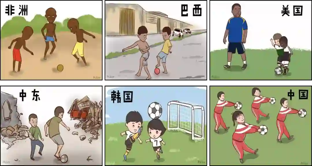 虽然足球起源于我国,但我国国足水平却很一般。国足与世界的差距始于儿童和青少年的足球培养。图 2 是各国小孩的足球活动,中国的足球操只耍不踢,老外都看傻眼了。