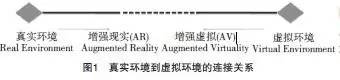 Milgram, Takemura, Utsumi and Kishino[2]定义了真实环境和虚拟环境的连接关系,如图1所示。从字面上理解,在真实环境上叠加虚拟的对象,就好像把现实环境要展示的内容“增强”了,所以就叫“增强现实”,反之即是“增强虚拟”。