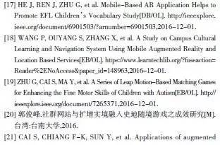 国内对增强现实技术在教育领域的应用的关注与日俱增。苏俊钦的“扩增实境(增强现实在台湾被称为扩增实境)应用于中文注音符号学习之研究”将增强现实应用于儿童学习注音符号。他们设计了一套中文注音符号学习教材,通过摄像头识别每个注音符号,在摄像头捕获画面上叠加呈现对应的虚拟动物图像,并以动画的形式告知儿童选取相应的标记以得到正确反馈。该研究旨在探究儿童是否能够在教育游戏中利用媒体辅助来获得有效的学习。结果表明这种与虚拟图像的简单交互可以有效增强儿童的兴趣,加深儿童对中文注音的印象[11]。