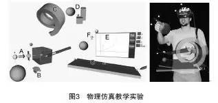 Vienna理工大学研究人员展示了AR技术在力学教学中的应用[7],如图3所示。它利用一个为电脑游戏所开发的物理引擎来实时模拟力学领域的物理实验,学生可以积极主动地在一个三维虚拟世界中创建自己的试验并加以研究。在实验之前、实验过程中和实验结束后,该系统均提供了多样化的工具,用以分析目标物体的受力、质量、运动路径等物理量。但该系统需要较昂贵的头盔、立体眼镜等设备。