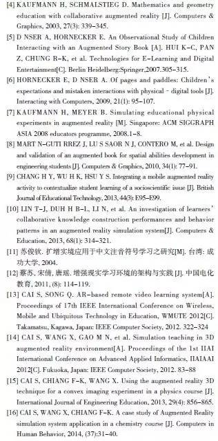 Cai, Wang, Gao and Yu[14]设计了本地和网络在线两种形式进行仿真教学的平台。在增强现实学习环境中,由于用户抛弃了鼠标、键盘而使用自然交互方式,因此与真实的环境中操作真实物理器具的感受一致。进一步来说,这种虚实融合的环境使得因一些成本、安全受限制,或者现实中根本无法实现的场景叠加到真实环境中,让学习者体验到了一种新颖、有趣而又不产生操作隔膜感的学习方式。