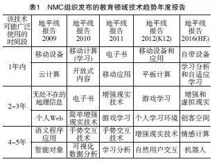 教育领域著名组织The New Media Consortium(NMC) 近几年发布的地平线报告中将增强现实技术列为未来几年最具潜力的六个技术之一,如表1所示。从 “简单增强现实技术”到“增强现实技术”的字眼变化可以看出这门技术正在迅速走向成熟应用。