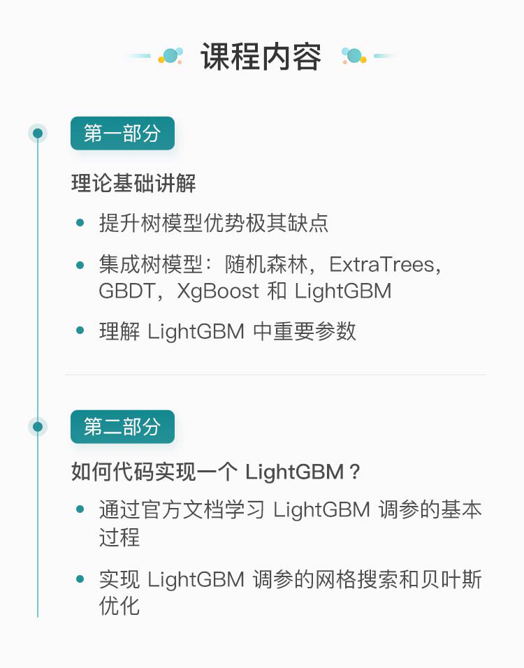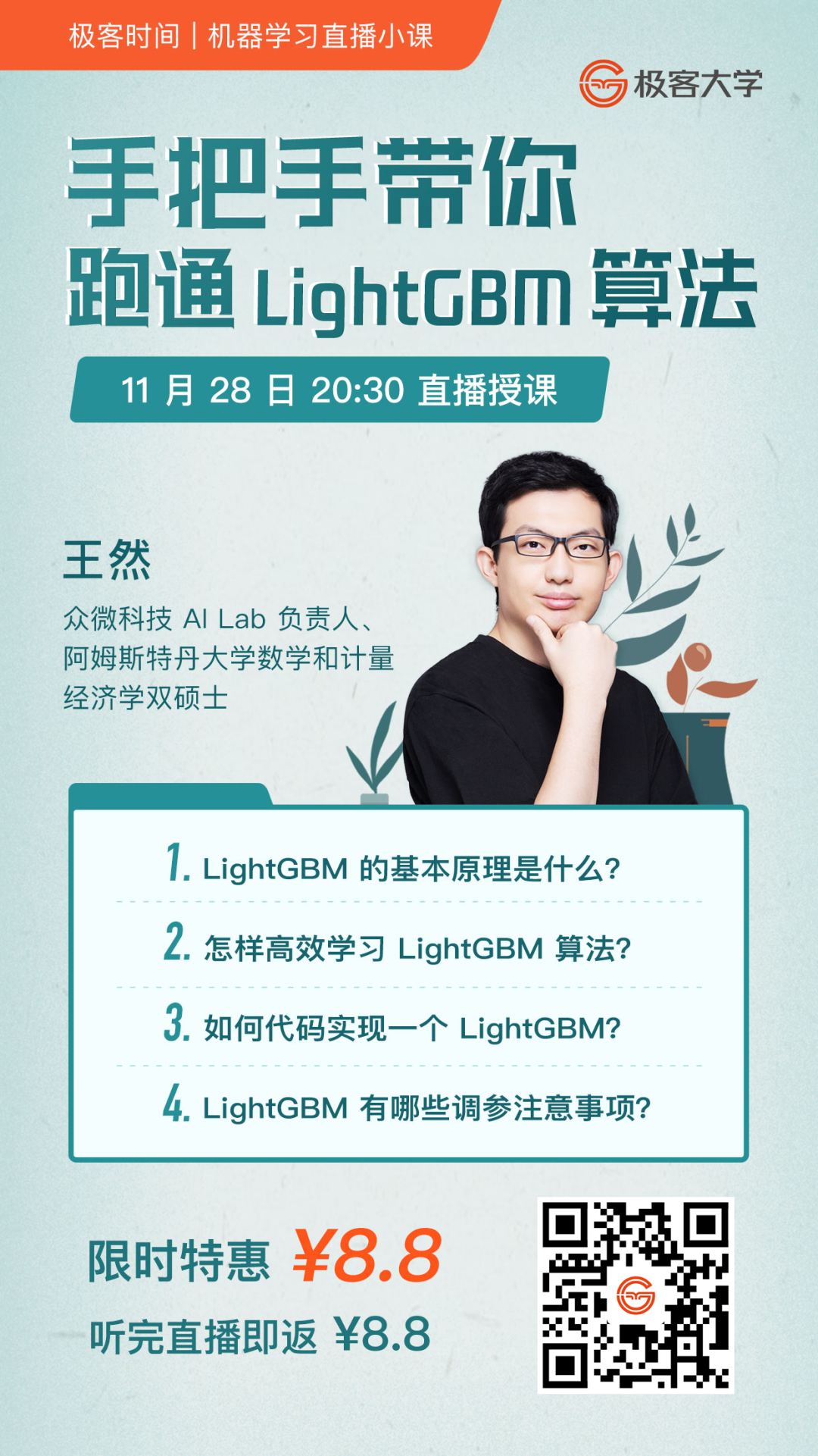 尽管困难真实存在,但它们都不是难以克服的,有些地方只是需要有人稍微点破即可。如果你有意愿继续学习和提升实力,在极客大学的直播小课堂里,实战经验丰富的老师就能直观明了的为你讲解 LightGBM 的原理,手把手带你调整参数、跑通程序,帮你打通学习机器学习的任督二脉。