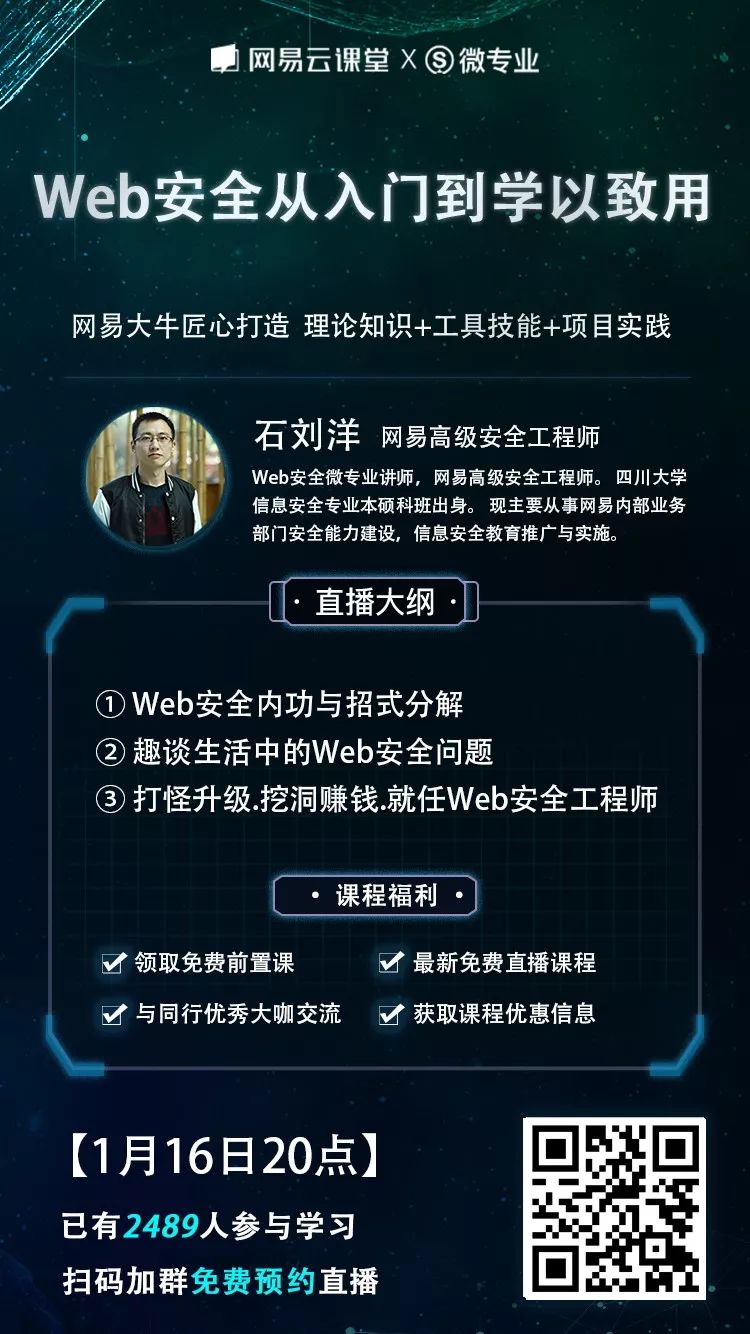 为了让大家更进一步了解 Web 安全的学习路径以及企业对安全人才的实际需求,1月16日晚上20点,我们邀请到 网易高级安全工程师石刘洋 在网易云课堂进行一场主题为《Web 安全从入门到学以致用》的免费的直播分享。