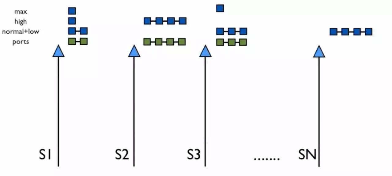 erlang VM 的 scheduler,是标准的 scheduler —— 每个 core 上一个逻辑意义上的 scheduler,有多级队列,按照 process 的优先级区隔。max 是 erlang 系统内部保留的优先级,往下是 high / normal / low,按这个顺序依次调度。normal 和 low 尽管在一个队列里,low prio process 要 N 次访问之才还会被调度。scheduler 还会处理其他活儿,比如 ports。ports 是 erlang 和外部世界(file,socket,driver 等)的接口,我们暂且按下不表。