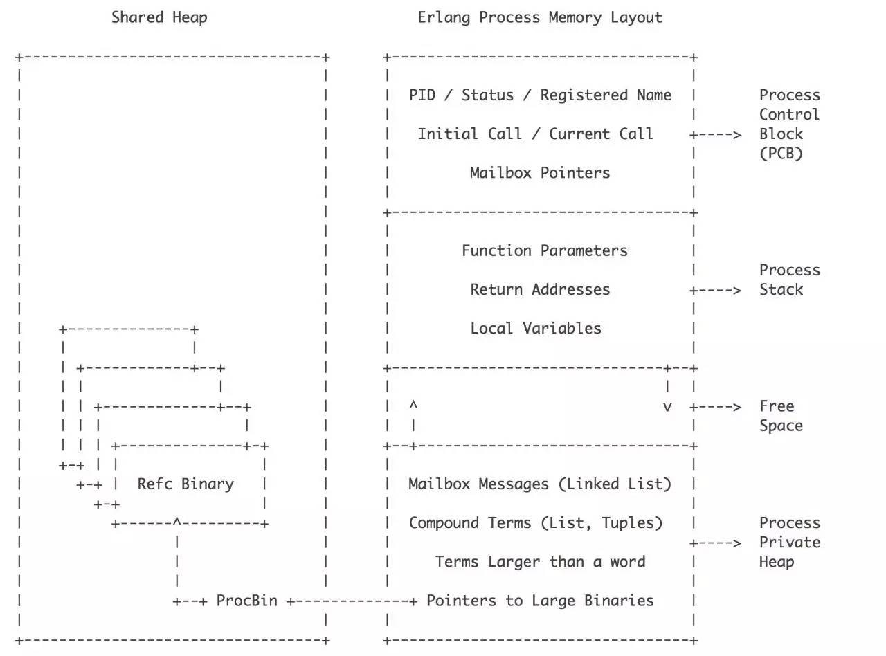 其实它和 OS 的 process 概念几乎一样,就是 PCB(Process Control Block),以及围绕 PCB 的 heap,stack,mailbox 等内存空间。只不过,erlang 的 process 的 memory footprint 很小很小,一个刚初始化的 process,也就占用几百个 words(32bit CPU 下,1 word = 4 bytes,64bit CPU,1 word = 8 bytes)。所以,erlang VM 能创建的 process 理论上取决于内存的大小,我们可以轻易创建百万级,甚至千万级的 process(32bit CPU 的 pid 用 28 bit,64 bit CPU 的 pid 用 60 bit,大家可以自行算算 process 的上限)。erlang 的 process 源自 actor model 的思想,它是几种常见的 concurrency model 的一种(其它的 model 请参考我的文章:Concurrency)。process 和 process 通过发送和接收消息来处理各种事务。