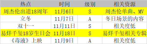 案例:以某音乐产品为例,将梳理出的热点放在表格中管理,并通过资源相关性、热点热度来评估该热点级别(S/A/B/C/D)。最终确定出我们需要在11月关注的重点是“周杰伦出道18周年”。