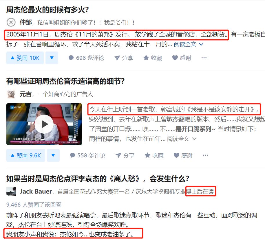 (1)知乎:周杰伦相关精华话题,高赞内容通常这样的画风。多为20岁+的答主,且大多在少年时代就喜欢周杰伦的作品。