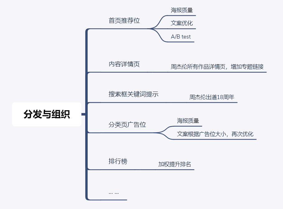 案例:以我们的音乐产品为例,确定了“陪我们走过青春的周杰伦——18年经典曲作”,该怎样做分发与组织?找到可以投放的渠道、推荐位,并根据节点特征进行优化。