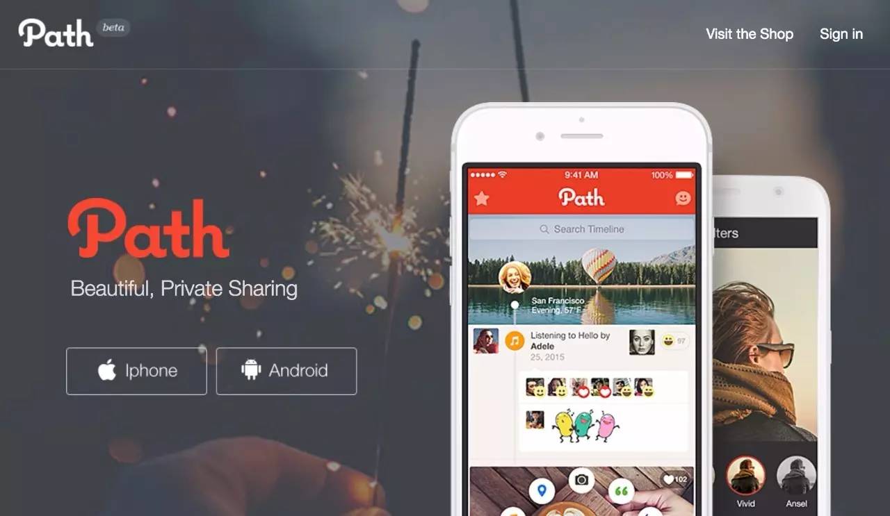 比 Snapchat 更早于 2010 年成立的私密社交应用 Path,以限制用户间的双向好友不能超过 50 人(后来调整为 150 人)、漂亮的设计为最大卖点,一度被认为是 Facebook 的有力挑战者。在微信承担中国人移动社交重任之前的那 1 年多时间里,我在 Path 上与 100 多个好友分享了上千条 Moments,Path 主打的私密社交确实让人们更放心地分享,并且积极得到好友们的反馈。