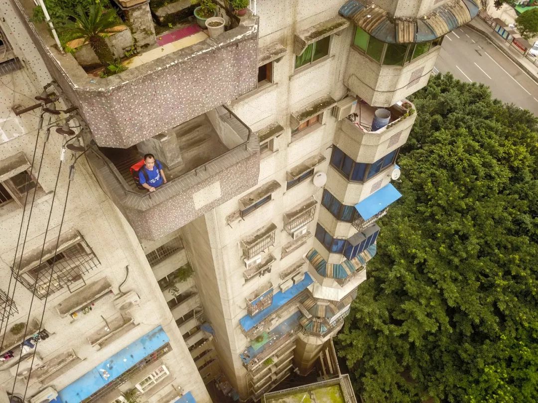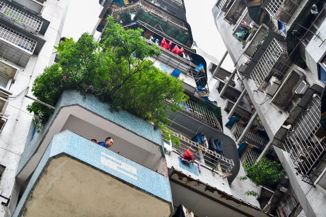 这个长江边的小区建于 1992 年,依山而建的是 6 座24 层没有电梯的楼房,大楼之间通过走廊连接。住在这里的是重庆最土著的市民,对游客来说,白象居拥有少有人找得到、又独属于重庆本地的浪漫风景,趁着傍晚的光线爬到楼顶发呆,站能望见不远处的长江索道划楼而过,就像是穿越进老电影。