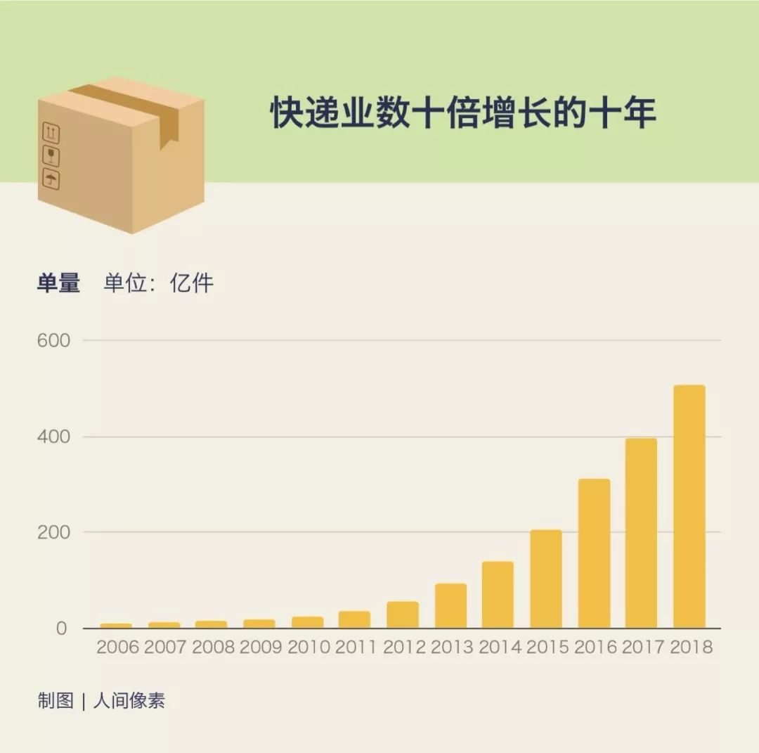 从 1980 年到 2000 年,中国快递用了 20 年的时间才使业务量达到 1 亿件,从 1 亿到 10 亿花了 6 年,之后 2006 年到 2014 年,从 10 亿件跨到 100 亿件。国家邮政局今年发布的数据则显示,2018 年全年全国快递业务量达到 507.1 亿件。