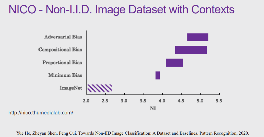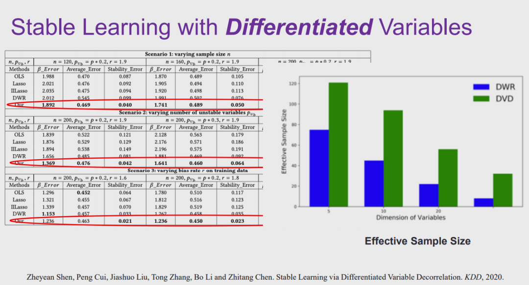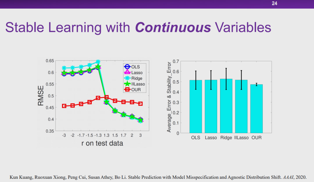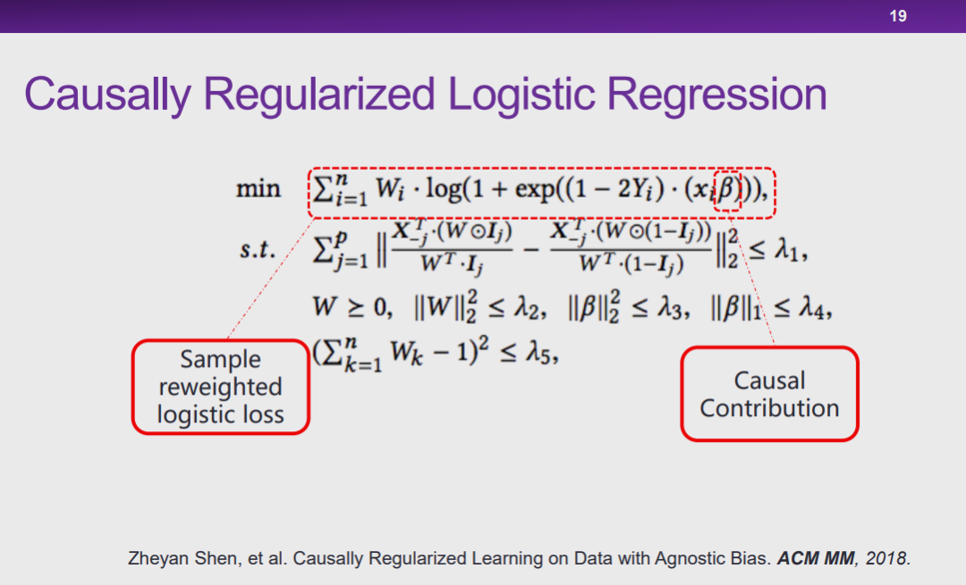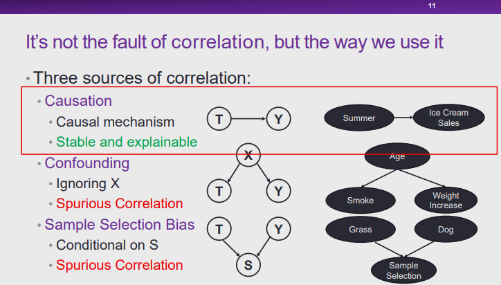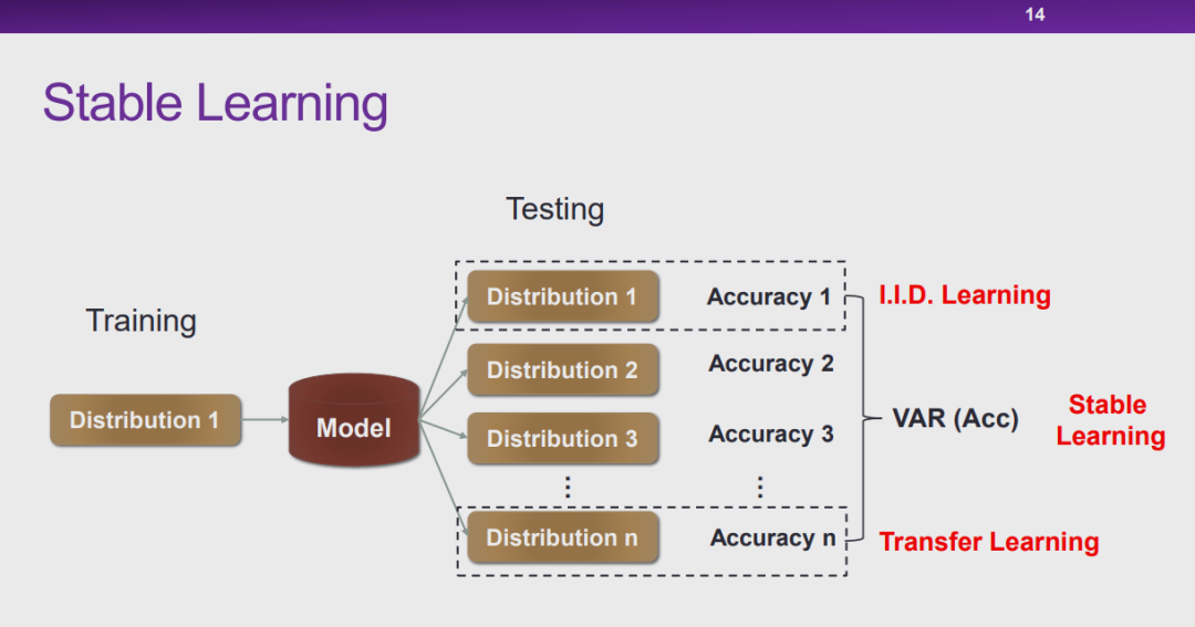 图 12:因果的定义实际上,人们很难在定义「因果」的问题上达成共识。从哲学的视角上看,「如何定义因果」、「因果是否存在」都是具有争议的问题。但是从机器学习研究者的角度来说,我们更加关注是否存在一种更好的统计的方式,能够发现数据之间存在的更本质的关联。在此,我们将为「因果」给出一个实用性的定义。在如图 12 所示的三角形框架中,为了探究 T 是否会导致 Y,我们首先控制住除变量 T 之外所有其它的变量 X。在控制 X 不变的条件下,我们对 T 施加一定的影响,如果 Y 会随着 T 的变化而变化,我们则称 T 对 Y 有因果效应。我们将因果效应的大小定义为:对 T 施加单位扰动时,Y 发生变化的程度。以上就是从干预的角度出发,对因果的一种解释。图 13:将因果引入机器学习的好处将因果的概念引入机器学习领域,会带来一系列好处。在上文中提到的对狗的图像进行分类的例子中,「草」和狗的标签、「狗的鼻子」和狗的标签之间都存在强关联,从关联的层面上说二者区别不大。然而,从因果的层面上来看,假设 T 代表「草」、Y 代表狗的标签。给定两组数据,在其它特征(例如,狗的鼻子)都相同的情况下,一组数据中有草地,另一组数据中没有草地。我们会发现,这两组数据中狗的标签的百分比分布并没有显著差别。这是因为只要图片中出现了狗的鼻子,无论出现草地与否,都会包含狗。在这种情况下,我们会发现「草」对标签 Y 实际上并没有因果效应。相对应地,如果令 T 代表「狗的鼻子」,在两组数据中都出现草地的情况下,一组包含狗的鼻子,另一组不包含狗的鼻子,则两组数据中 Y 的百分比分布肯定会存在差异。因此,通过度量,我们发现「狗的鼻子」对狗的标签有因果效应。在因果的框架下进行度量时,「草」对于狗的标签存在非常弱的因果关系,而「狗的鼻子」和狗的标签存在非常强的因果关系。可见,如果我们在学习问题中依赖「因果」进行预测,模型的可解释性和稳定性都会得到提升。在此基础之上,崔老师的团队提出了「稳定学习」的概念。 6