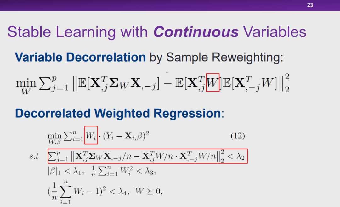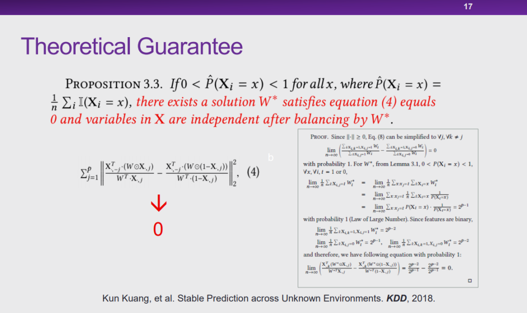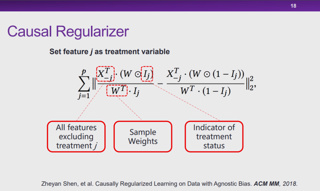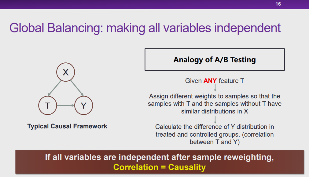 图 14:稳定学习假设我们利用符合分布 1 的训练数据训练机器学习模型,如果我们在测试阶段使用的是同样符合「分布 1」的数据,那么这种情况就是满足独立同分布假设的学习问题。此外,当我们在测试时使用的是与「分布 1」不同的「分布 n」的数据,我们就需要通过迁移学习技术针对「分布 n」对模型进行优化。然而,尽管迁移学习技术可以在一定程度上解决这种特征分布偏移的问题,但它所面临的场景仍然不是最普适性的情况。这是因为,在迁移学习框架下,尽管并不要求测试数据和训练数据的分布必须一致,但是我们需要知道测试数据的分布才能进行进一步的域适应。不幸的是,在实际情况下,我们往往无法控制测试数据如何产生。因此,我们希望在将模型应用到不同的数据分布下的时候,针对准确率的方差进行优化,使准确率的波动可控或者为一个极小的量。同时,另一个需要优化的目标是模型的平均性能。如果我们能够保证模型在不同环境下具有可靠的模型性能,并且能够优化性能波动的方差,那么就可以实现「稳定学习」。图 15:因果推理的平衡我们将基于因果推理中的「混淆变量平衡」的思想来实现稳定学习。在因果推理领域中,如果我们想要根据可观测的数据估计 T 对 Y 的因果效应,首先要控制其余的所有变量 X 不变。然而实际上,当我们将数据划分为 T=0 和 T=1 的两组后,并不能保证两组数据中变量 X 的分布保持一致。因此,我们往往会通过使用「直接混淆变量平衡」(directly confounder balancing),即对试验组和对照组两组数据的样本进行加权,使得这两组数据加权后的 X 分布一致,此时这种设定就可以满足上文中对因果效应的定义。实际上,这种操作是通过样本加权的方式使得 T 和 X 相互独立。当 T 和 X 独立之后,度量 T 与 Y 之间的关联性等价于计算 T 与 Y 之间的因果效应。图 16:全局平衡当我们试图将上述思想推广到机器学习领域中时,一个重要的差异是:在因果领域中,我们度量的是单个变量对输出变量的因果效应,而在机器学习领域中我们需要使用所有的输入变量预测输出变量。因此,稳定学习旨在将上述思想推广到全局的层面上,试图学习一组样本权重,通过样本加权的方式使所有的输入变量之间都相互独立,从而可以利用现有的基于关联的模型实现基于因果的预测。 7