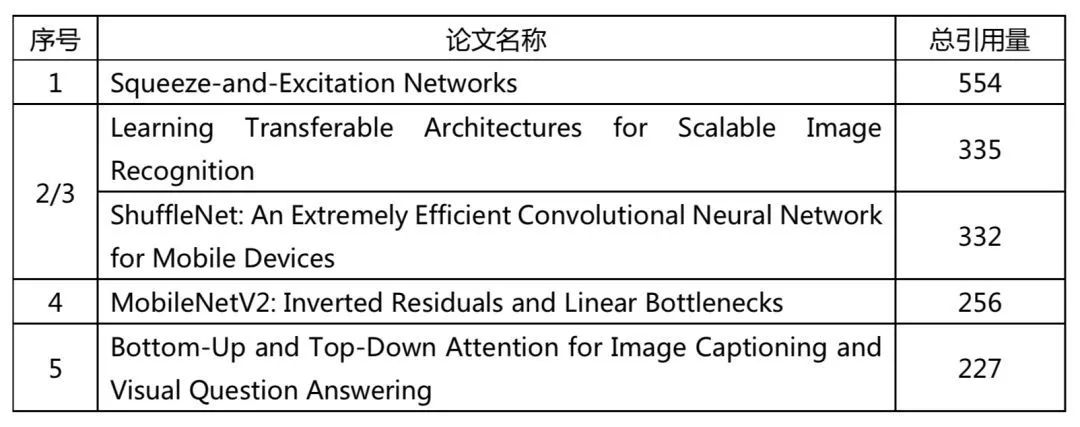 根据 CVPR 2018 的论文列表(http://openac-cess.thecvf.com/CVPR2018.py)在谷歌学术进行搜索,得到数据如下(以 2019 年 3 月 19 日检索到的数据为准,因第 2 名及第 3 名数据十分接近,不做明确排名) :