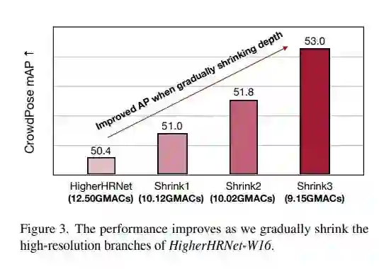 然而实验结果发现,随着模型的缩减,性能却是在提升的,这说明对于轻量模型而言,多分支高分辨率的结构是比较冗余的。这个结论其实不难理解,轻量模型原本就算力吃紧,很难在层数、通道数都极其有限的高分辨率分支上学到太多有益的东西,与其将有限的计算量浪费在这里,不如集中资源发掘高层的语义信息带来的收益高。
