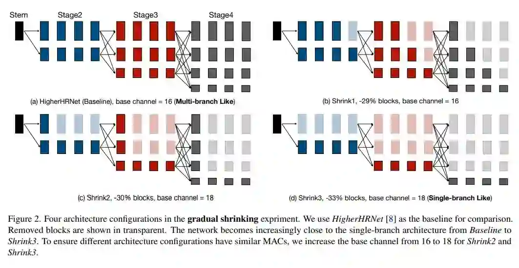 本文基于以上问题,设计了一个非常直观的实验,将一个HigherHRNet进行逐步缩减,渐进式地扔掉其中的一些模块和分支,直到最后还原成一个接近于单分支结构的模型,在这个过程中保持模型整体的计算量不变,如下图所示: