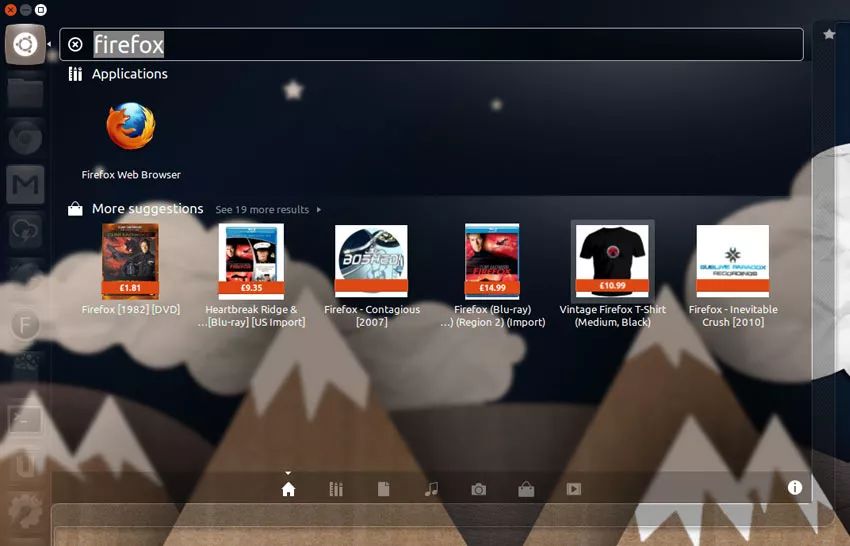 购物镜头(Shopping Lens)-- 后来被许多人贴上了间谍软件的标签 -- 在字面上的概念简洁易懂:当你在Unity Dash用一个与“购物”相关的词搜索时,一些“相关”的购物推荐与其他来源的匹配内容一起显示给你了。