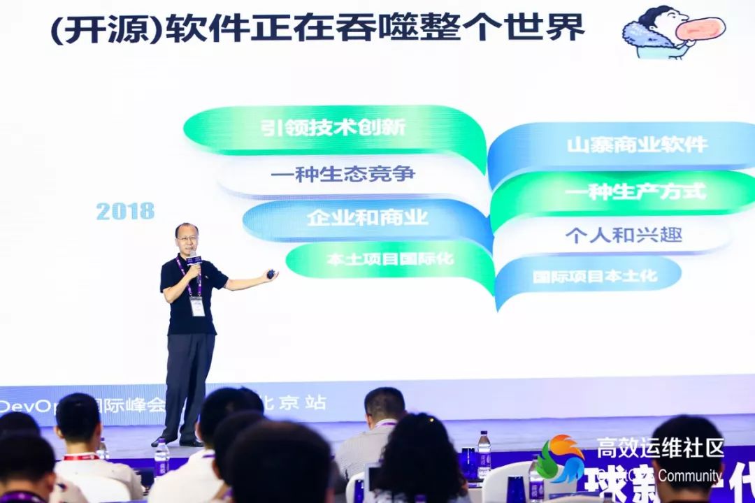 随后是主会场的第一场主题演讲,由中国信息通信研究院云计算和大数据研究所所长何宝宏博士带来:“互联网二十年,开源的“绿帽子”和技术的食物链”。
