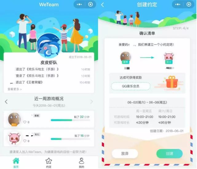 通过家长和孩子双向同意后组建的 WeTeam,双方可以互相知晓对方的游戏和网络使用时间鼓励孩子与家长通过线下交流的方式商量上网和游戏时间,并以平等的身份互相监督。