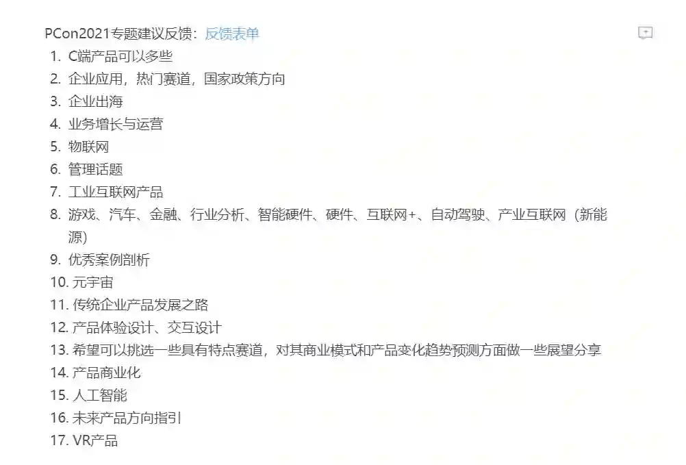 除此之外,在首届 PCon 落地之后,我们收到了近 200 条反馈建议,大约分为以下几类。