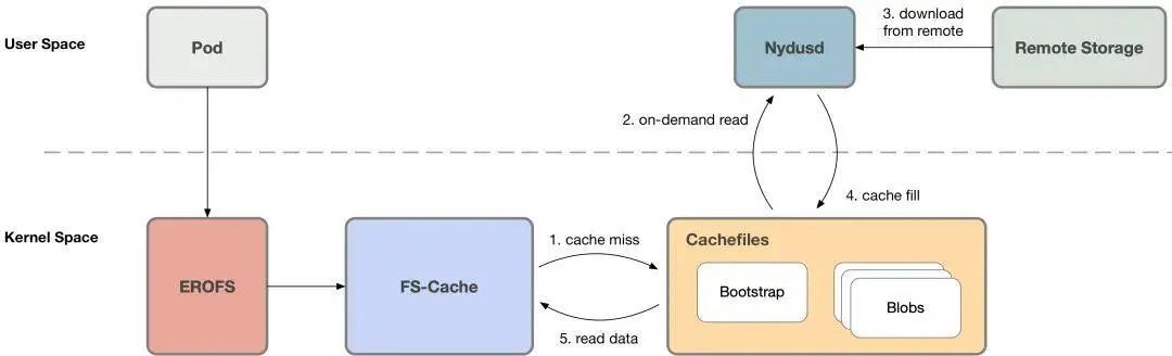 否则 (cache miss) 需要通知用户态的 Nydusd 进程以处理这一访问请求,此时容器进程会陷入睡眠等待状态;Nydusd 通过网络从远端获取数据,通过 fscache 将这些数据写入对应的缓存文件,之后通知之前陷入睡眠等待状态的进程该请求已经处理完成;之后容器进程即可从缓存文件读取到数据。