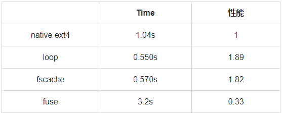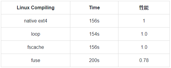 可以看到,fscache 模式下的 Linux 编译负载性能与 loop 模式、原生 ext4 文件系统的性能基本持平,同时要优于 fuse 模式。