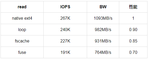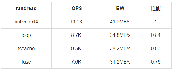可以看到,fscache 模式下的 read/randread 性能与 loop 模式下的性能基本持平,同时要优于 fuse 模式;但是与原生 ext4 文件系统的性能仍存在一定差距,我们正在进一步分析和优化,理论上该方案可以达到原生文件系统的水平。