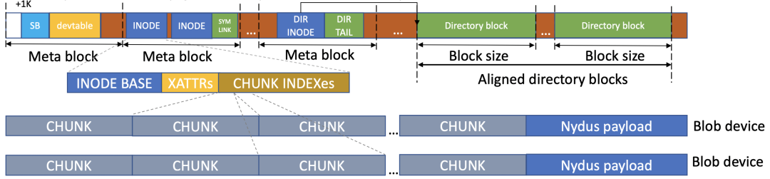 其中将容器镜像文件系统的数据 (blobs) 和元数据 (bootstrap) 分离,让原来的镜像层只存储文件的数据部分。并且把文件以 chunk 为粒度分割,每层 blob 存储对应的 chunk 数据;因为采用了 chunk 粒度,这细化了去重粒度,chunk 级去重让层与层之间,镜像与镜像之间共享数据更容易,也更容易实现按需加载。由于元数据被单独分离出来合为一处,因此对于元数据的访问不需拉取对应的 blob 数据,需要拉取的数据量要小很多,I/O 效率更高。Nydus RAFS 镜像格式如下图所示:
