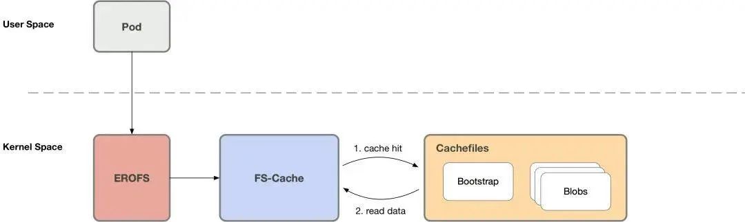 事实上我们可以将按需加载的 1) 缓存管理和 2) 缓存未命中的时候,通过各种途径 (例如网络) 获取数据 ,这两个操作解耦开。缓存管理可以下沉到内核态执行,这样当镜像在本地 ready 的时候,就可以避免内核态 / 用户态上下文的切换。而这也正是 erofs over fscache 技术的价值所在。
