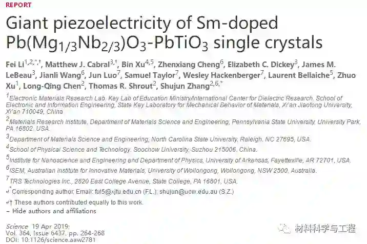 近日,西安交大李飞教授和徐卓教授及其合作者在弛豫铁电单晶材料高性能化研究方面取得了重大突破,其研究成果于今天(2019年4月19日)在国际顶尖期刊《Science》上发表。