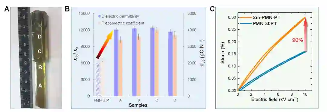 图A 钐掺杂的铌镁酸铅-钛酸铅晶体照片;图B 晶体压电系数和介电常数;图C 晶体电致应变测试曲线。